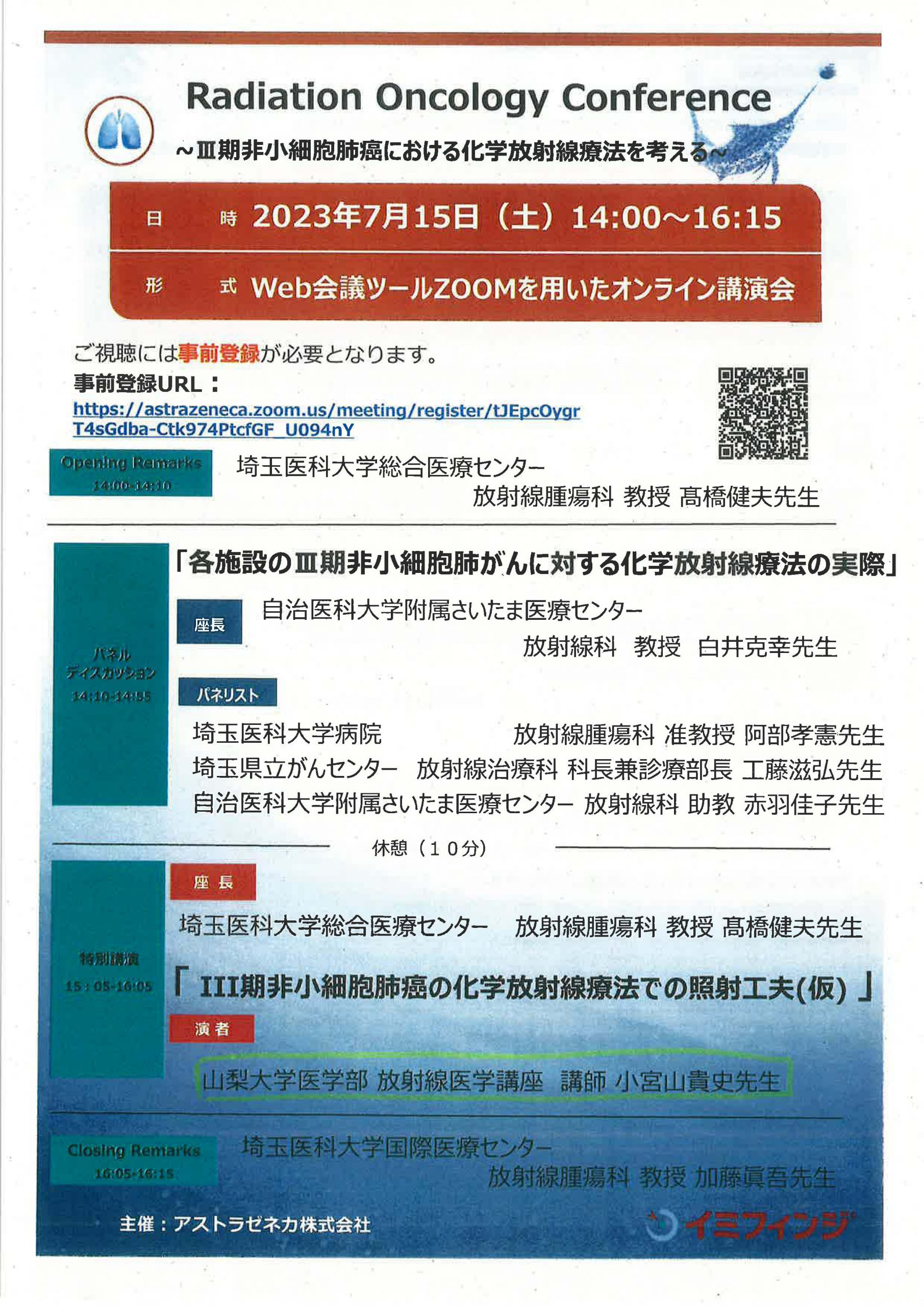 来る7月15日(土)14:00~16:15、「Radiation Oncology Conference ~Ⅲ期非小細胞肺癌における化学放射線療法を考える」がオンラインにて開催され、当科の小宮山先生が特別講演を行います