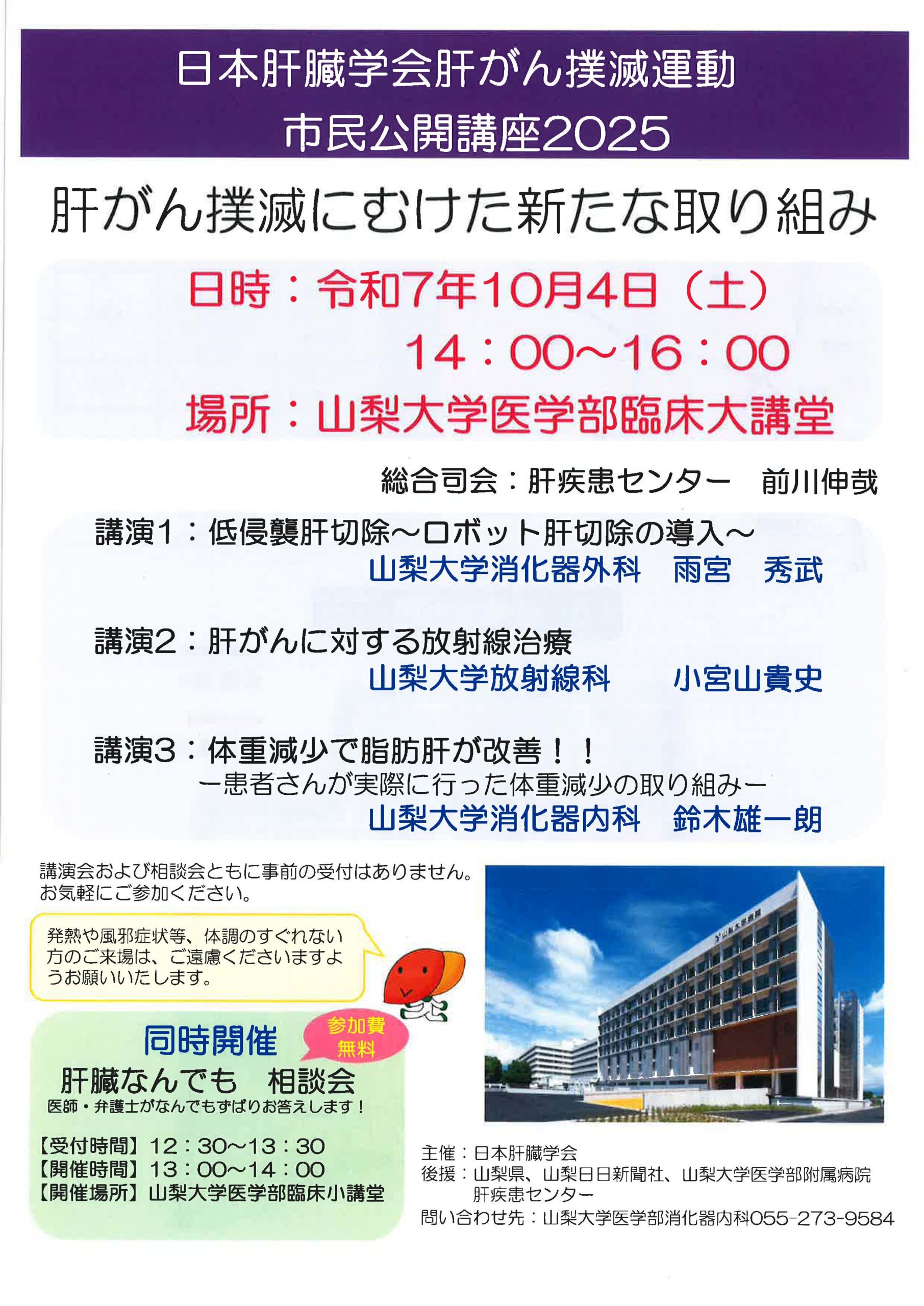 来る、10月4日(土)、山梨大学医学部臨床大講堂にて【日本肝臓学会肝がん撲滅運動 市民公開講座2025】が開催され、放射線治療学講座の小宮山貴史先生が講演を行います。